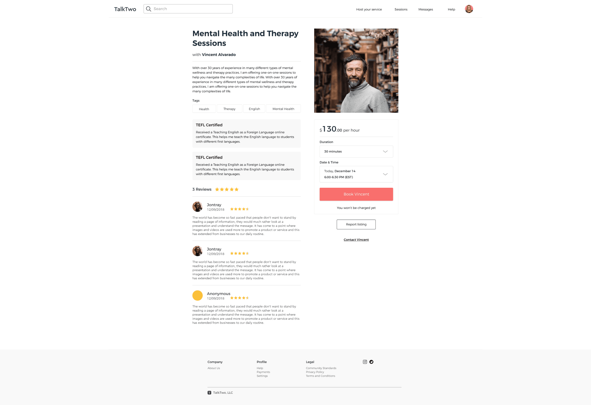 I co-founded TalkTwo, a marketplace designed to broaden the availability of mental health professionals and enhance access to their services.