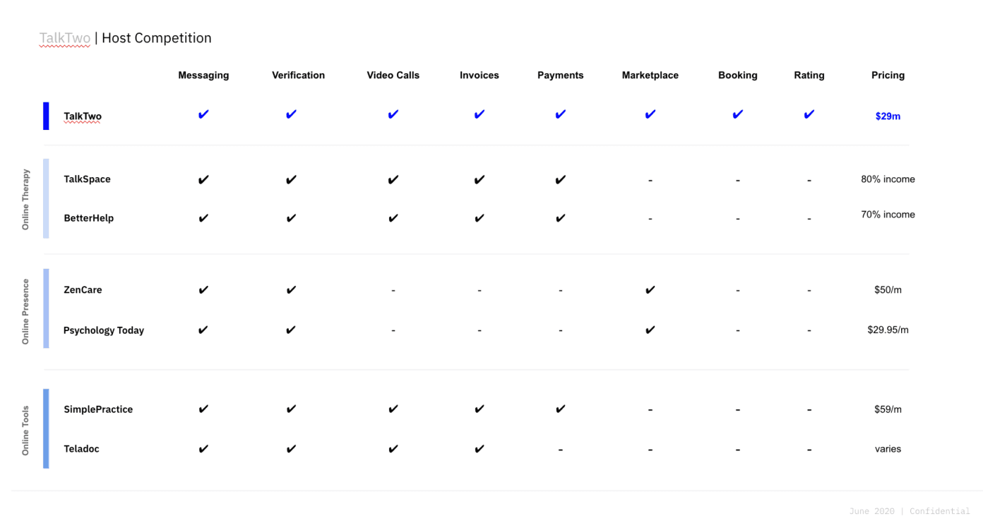 Ultimately therapists used us to find new clients, but quickly tried to move those clients to Facetime or other "free" video alternatives
