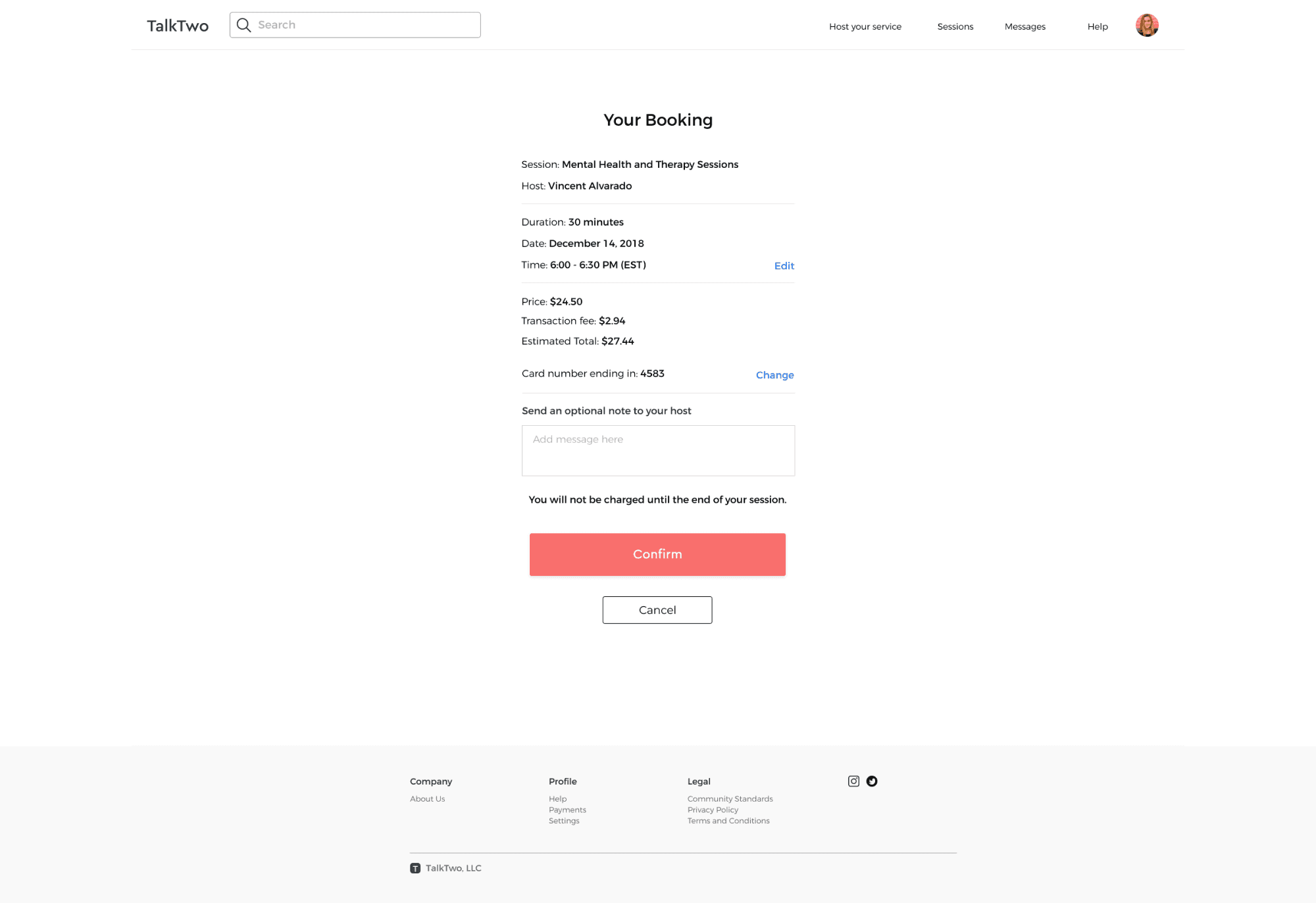 Patients could select a duration and see the cost of the sessions change based on that duration. Durations would be set by the Provider during onboarding. After booking a session the provider and patient would have access to a chat where they could communicate if things changed or need to reschedule.